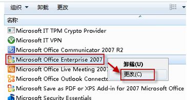 5、右击 Microsoft office 2007/2010,选中“更改”。(对于 Microsoft office 2003 的操作与此类似);