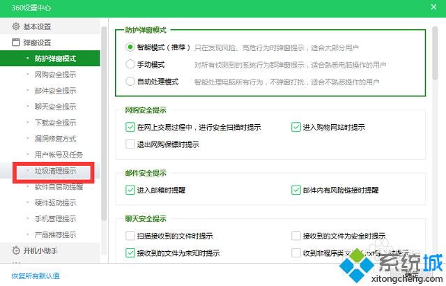 3、打开“360设置中心”窗口后,在左侧依次展开“弹窗设置--垃圾清理提示”;