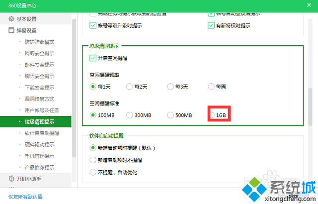 4、然后在右侧窗口找到“垃圾清理提示”,在此可以设置提醒频率和提醒标准,不想提示也可以将其关闭,设置完成后打开确定便可。